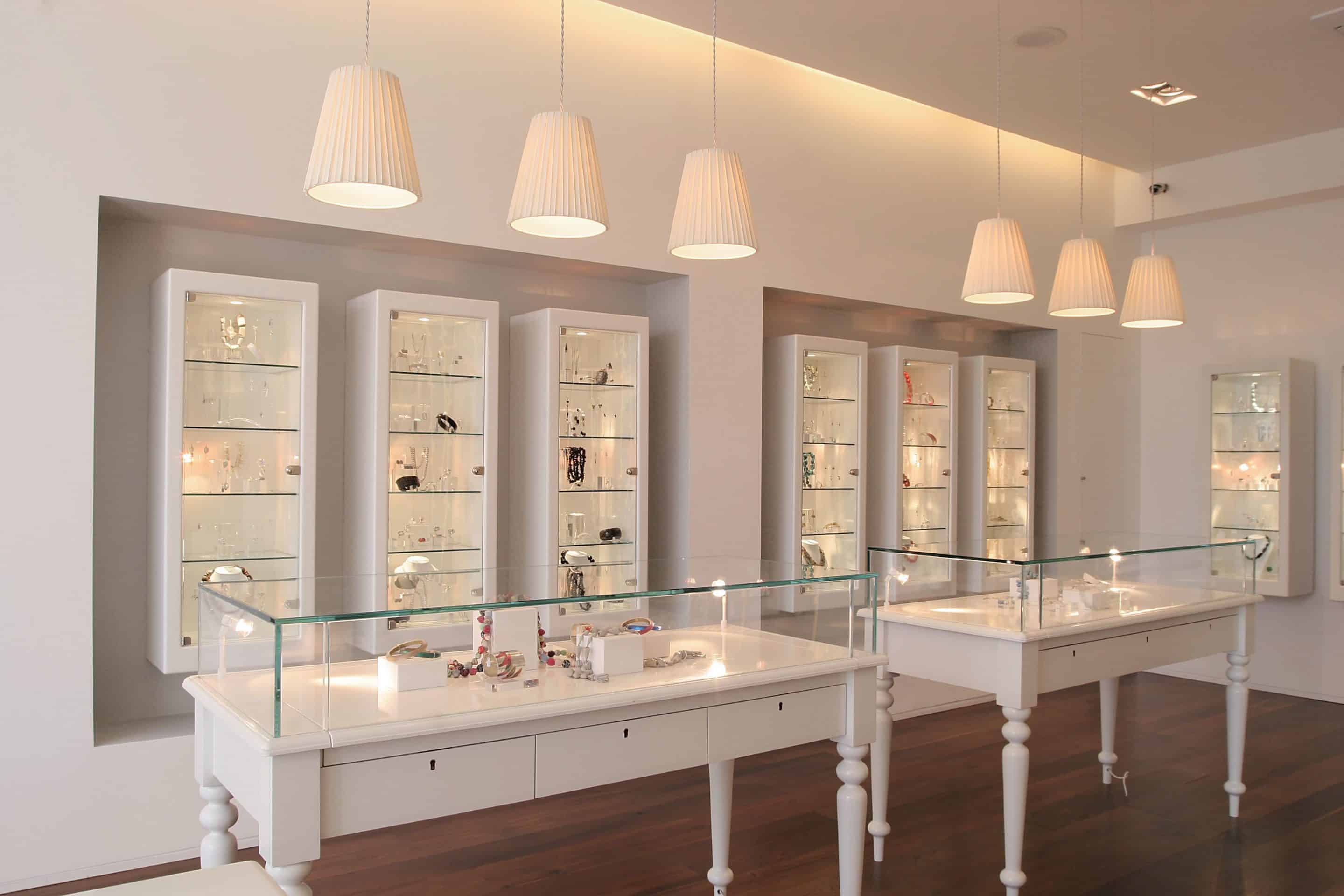 The importance of proper lighting in luxury retail & museum displays. Options include dimmable LEDs, spotlight strips, and motion sensors.
