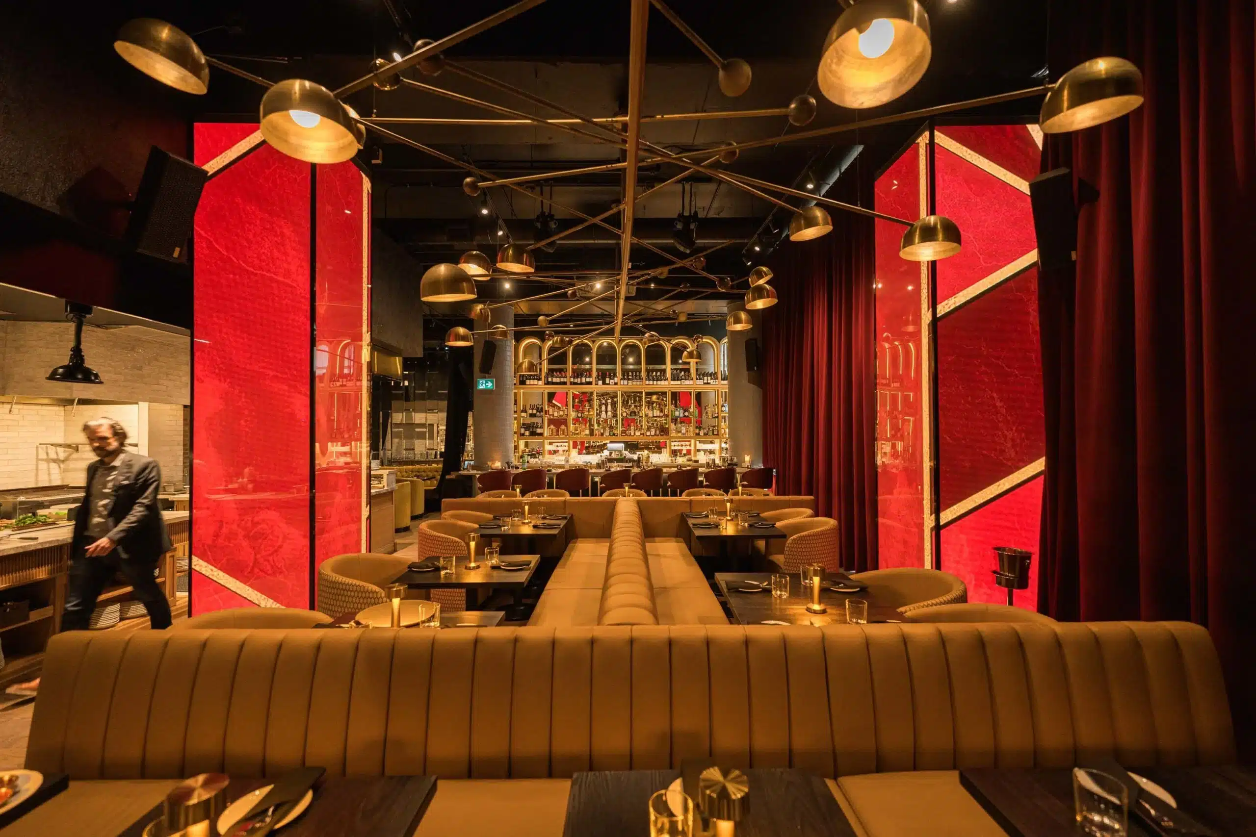 - Custom Host Stand: A statement entry piece integrating warm wood tones with brushed brass details.